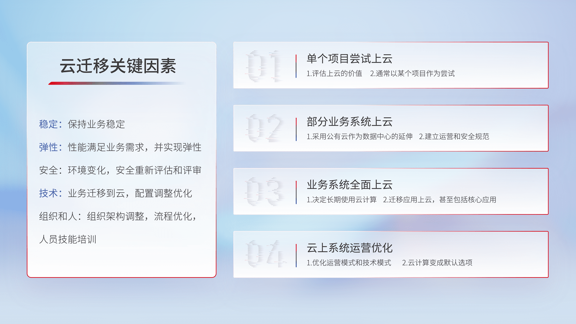 结合实际业务,,,,从规划设计、、、云平台选型、、云原生改造、、、数据迁移、、集成交付,,,,迁移全过程为客户识别最佳上云路径,,做好风险识别管理,,设计网络架构、、、、身份权限、、、、安全审计合规、、操作审计、、、日志审计、、监控告警策略、、、多站点容灾设计等,,,,对云上基础设施进行整体规划,,,,提升IT治理水平,,,,以满足弹性、、、高可用、、高性能的需求。。。。